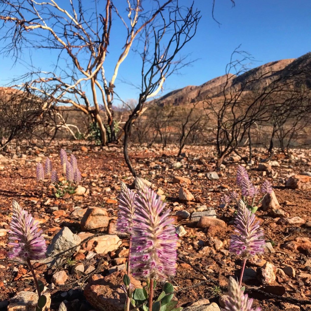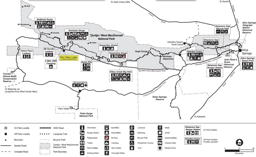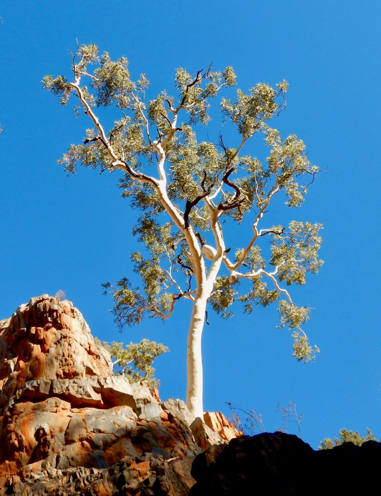 Tjoritja, also known as the West MacDonnell Ranges dominates the red centre of Australia. It stretches east of me from my vantage point. They fold, they snake, and they divide into several long creases away into the hazy dusty distance. There are layers of different coloured rock exposed like the ribs of a large mythical beast. This is the spine of a living desert.