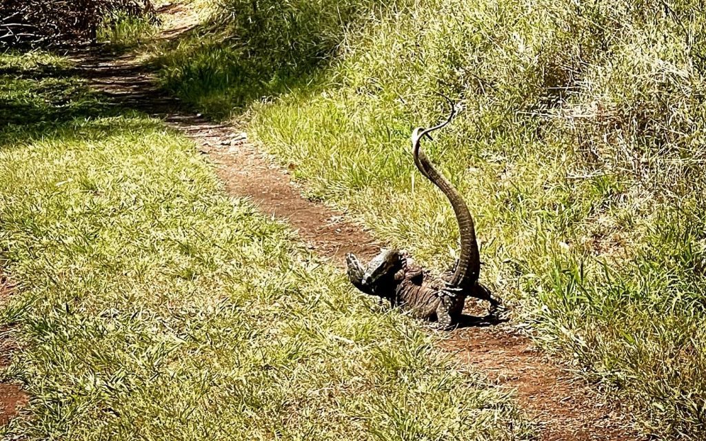 Lace monitors, also known as tree goannas, belong to the genus Varanus, a group of lizards that include the perentie (Australia’s largest lizard) and the Komodo dragon (the world’s largest lizard) which is found in Indonesia. Lace monitors grow to around 2m in length and come complete with long claws, sharp teeth, and poison glands. And they do like a good scrap! They’re not aggressive but I wouldn’t annoy one!
